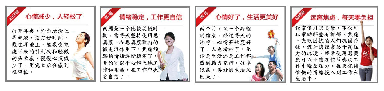 思奥康 采用“经颅微电流刺激疗法” (Cranial Electrotherapy Stimulation,简称CES)。它以特殊波形及频率的微量电流,直接作用于影响情绪和睡眠的大脑边缘系统,促进大脑的脑电波恢复正常,调节多种与情绪和睡眠有关的神经递质分泌,以起到治疗效果。相较于传统药物治疗,它起效更快,效果更明显,无副作用,使用更方便安全。
