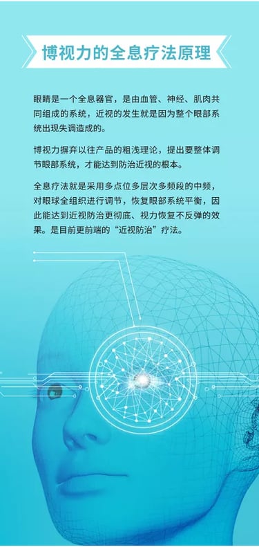 【博视力智能眼科理疗仪】透过“全息疗法”,在调整眼部的同时,眼部的穴位对应着全身各脏器,所以作用眼部的穴位是可以调整全身各脏器的代谢平衡。因此,除了青少年近视,各种年龄组的人都可以通过对眼部全息穴位的治疗而达到疗愈的作用,进而恢复机体的正常。